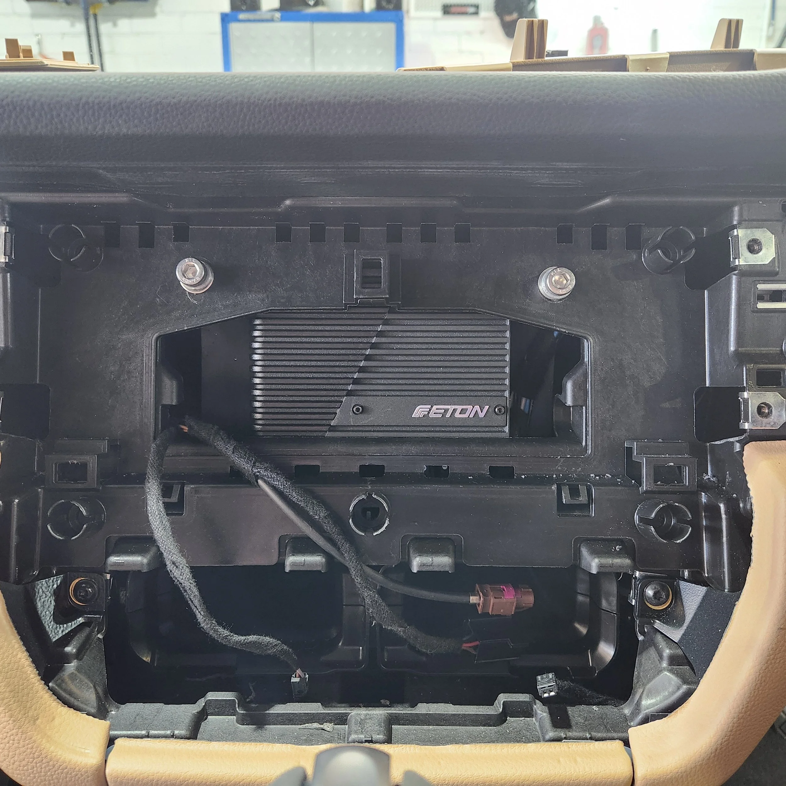 The amp presented an interesting challenge, as there’s next to no cavities in the Macan dashboard that we could hide the amp while still providing us access to tune it. Our solution was to custom-fabricate a mounting plate that we could hide in behind the OEM screen. Our only permanent modification to the car was the two holes that we drilled through the sub-dash to pass these bolts through, and once the screen goes in it’s impossible to see. The hole behind the screen gives us access to the ETON tuning controls without needing to remove the entire dashboard.
